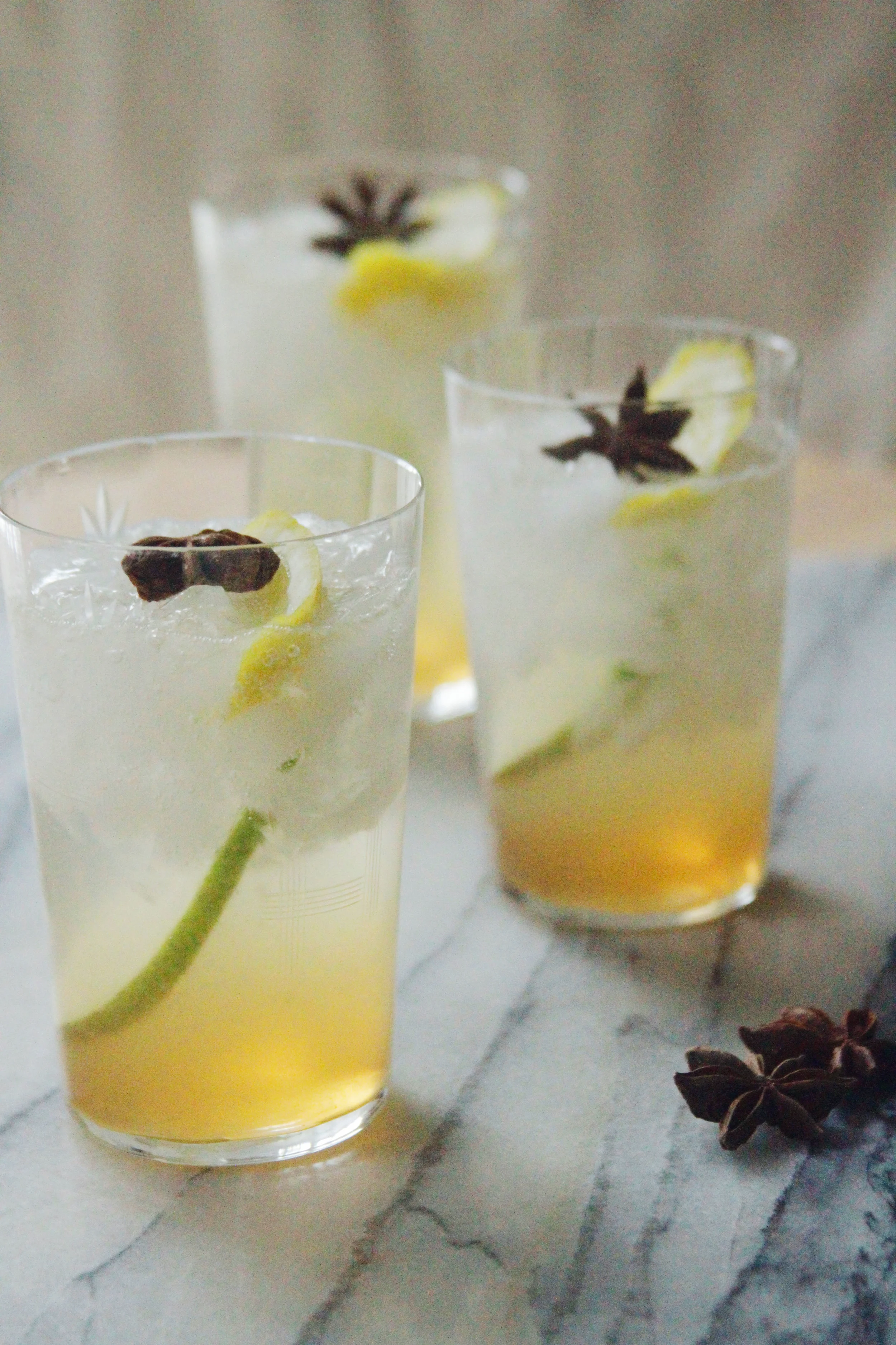 To serve fill each class halfway with the lemonade mixture. Add 1 tablespoon of the shrub. Top off each glass with sparkling water for some fizz. Serve each drink with a slice of pear, lemon peel, star anise or all three. Drink up.