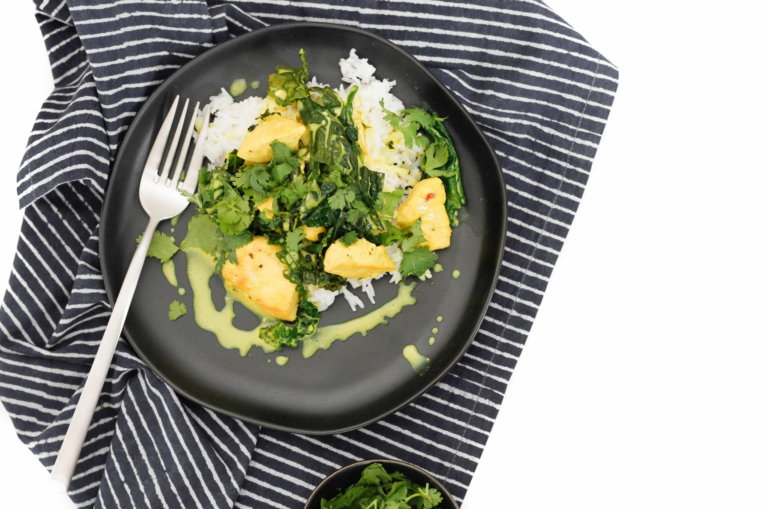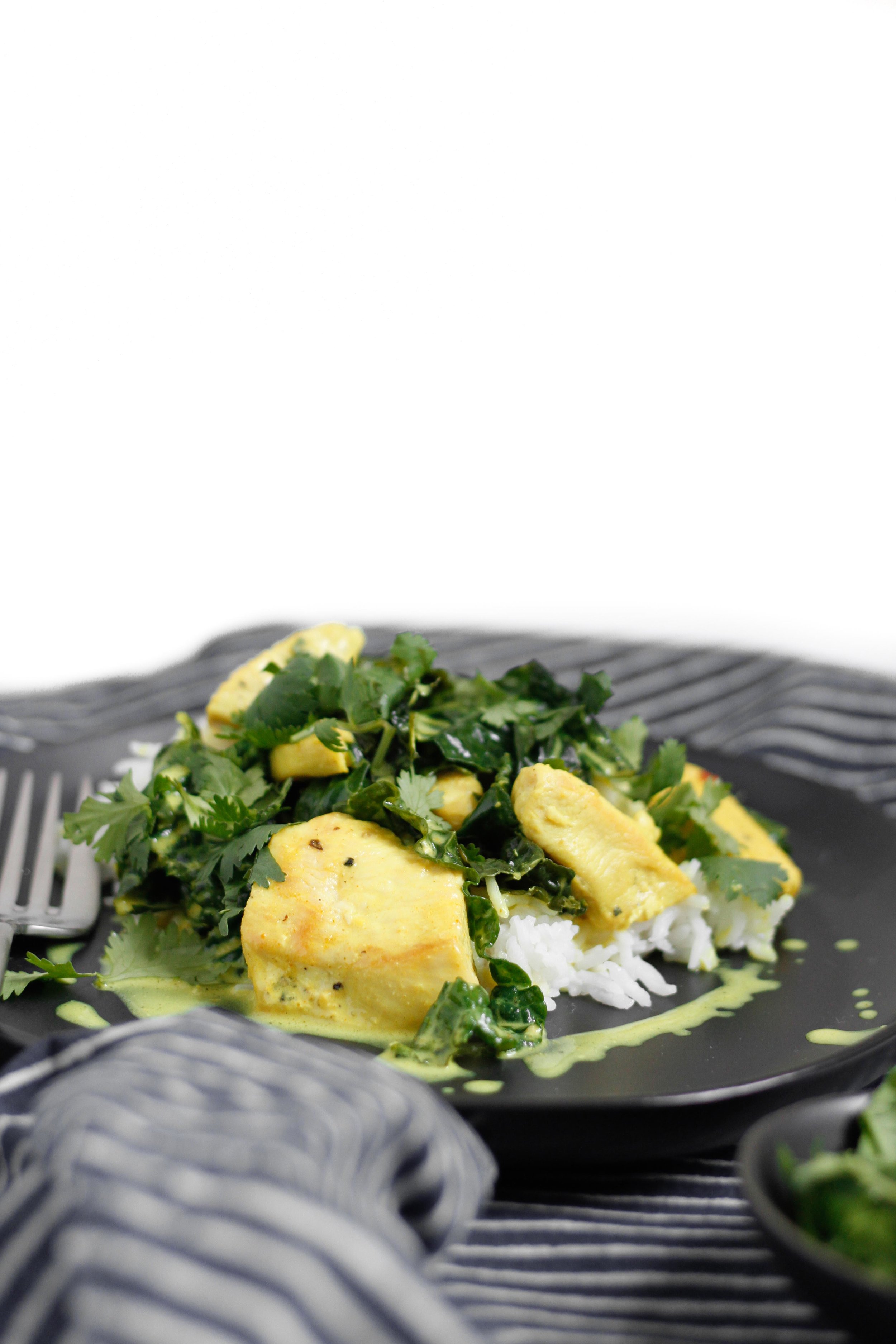 Start by cubing the chicken breasts, then sprinkling the cubes with salt and pepper. Brown the chicken in a pan in a tablespoon of olive oil on medium-high heat. Once golden on both sides, remove the chicken from the pan. Reduce the heat to low.Remove the stems from the kale and slice it thin into ribbons.Add 1 tablespoon of oil back into the same pan, then add the garlic. Stir the garlic around until you can smell it, then add the kale and toss the ribbons in the garlic oil until coated.Add the turmeric, cumin, and a sprinkle of red paper flakes, coating the kale in the spices. If you'd like an even spicer curry, add hot sauce or Sriracha. Shake, then add, the entire can of coconut milk. Stir everything together once again and bring the sauce to a simmer.To finish, add the chicken back into the pan, including any juices. Keep simmering, until the chicken is cooked through.Serve with rice and chopped cilantro.