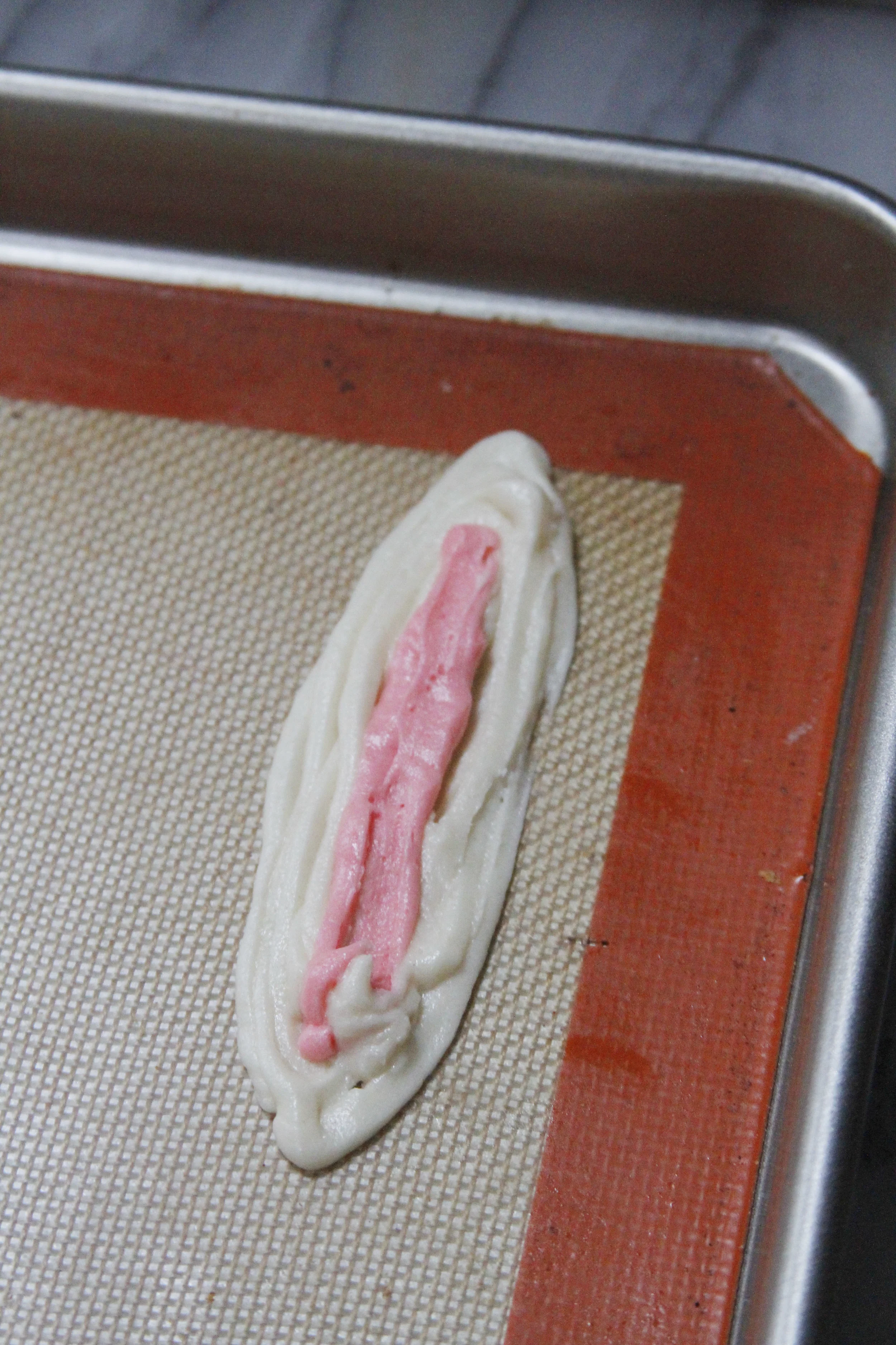 My favorite trick for a quick piping bag is to use ziplock bag + snip off the tip. For those recipe you can use a gallon bag for the plain dough + a small bag for the pink dough.
