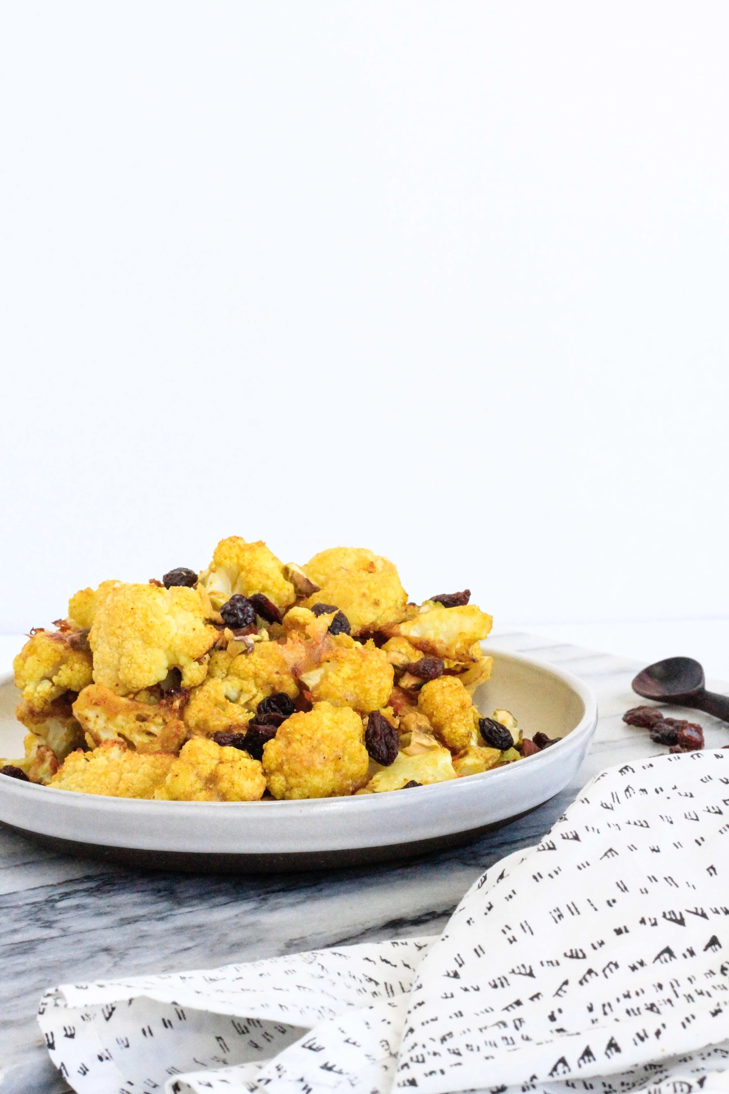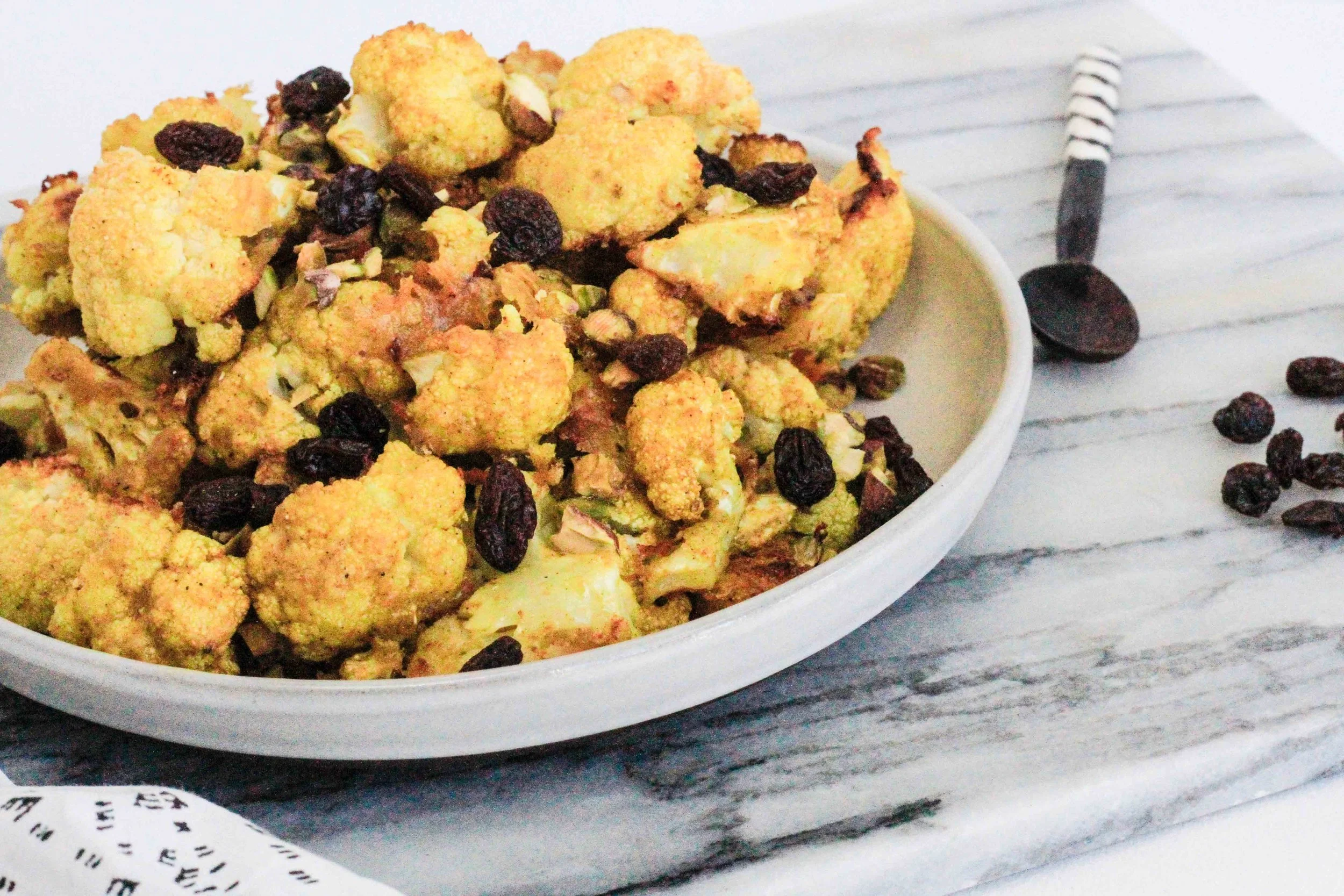 Remove the cauliflower from the pan and into a large bowl. Toss in the raisins and chopped pistachios. Dive in while warm.