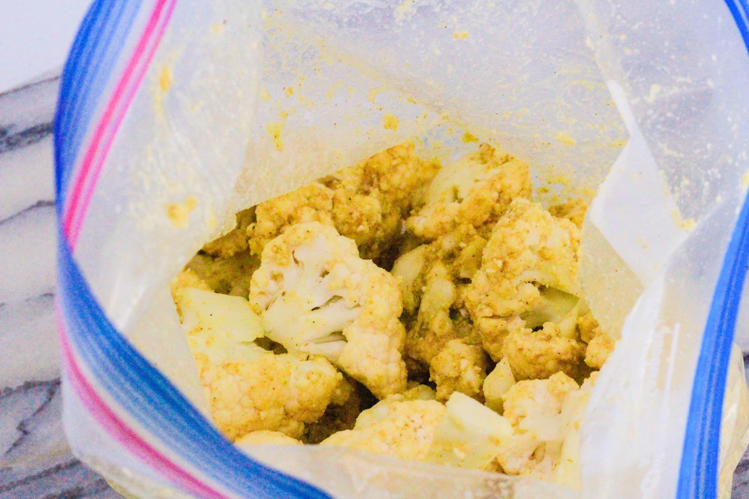 In a large ziplock bag, combine the cauliflower florets, turmeric, olive oil and parmesan cheese. Feel free to add some salt and pepper too!