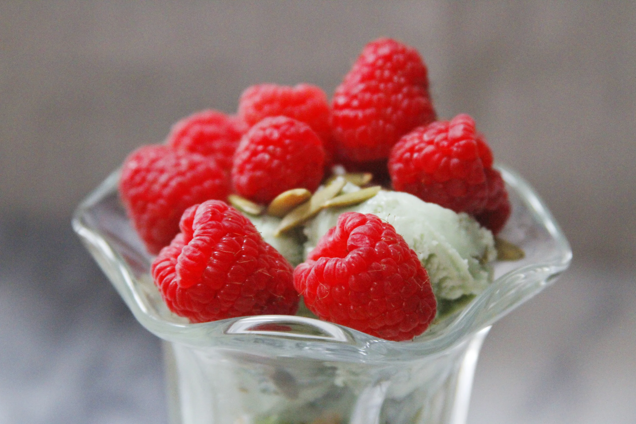 But for easter there seems to be some rules. Frilly cakes, bunny-shaped that + chocolate filled plastic eggs--so I wanted to create something that looked like Easter without being so....Easter? A raspberry pistachio ice cream sundae, that's how!