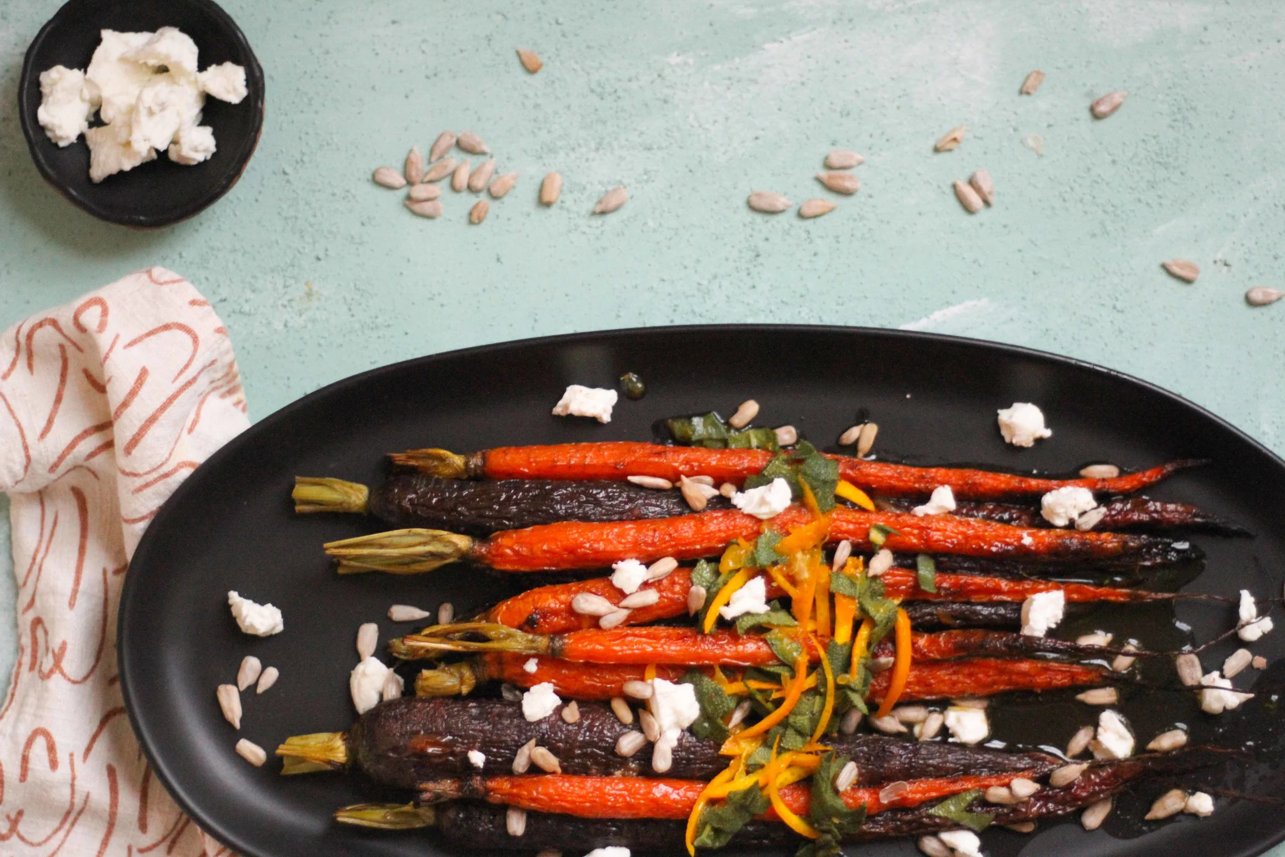 - Drizzle the carrots with olive oil and a sprinkle with cumin and salt. Roast the carrots in the oven for ~30 minutes until the skin is crinkly and the carrots are softened.