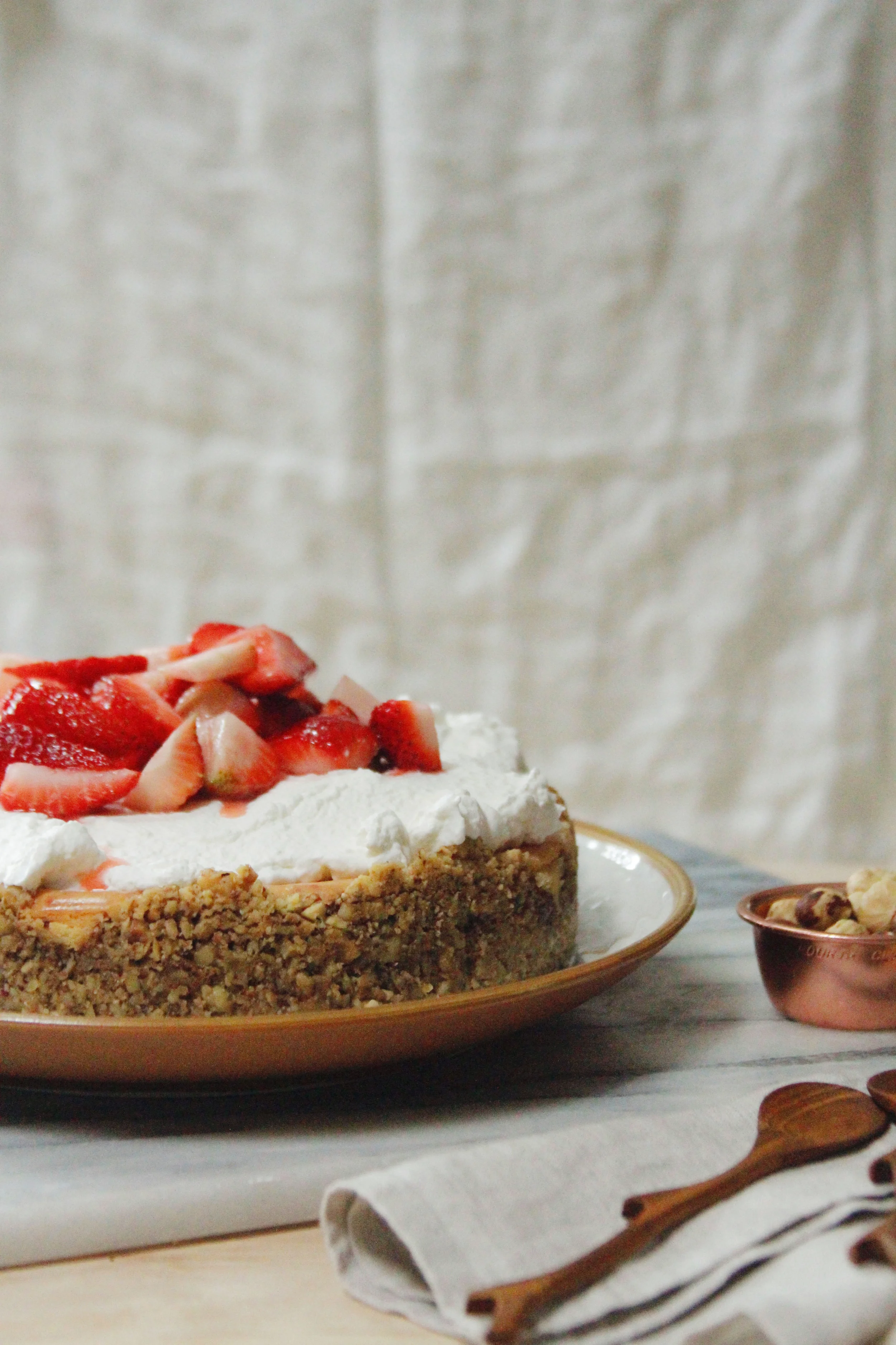 One issue, I didn't have a recipe for one. So instead of buying one like a normal person, I experimented by creating my own. It took a few tries, but I'm really proud of this one. It's creamy + nutty + fruity. It's just like a classic cheesecake, but there's a nut crust which takes it up a notch.